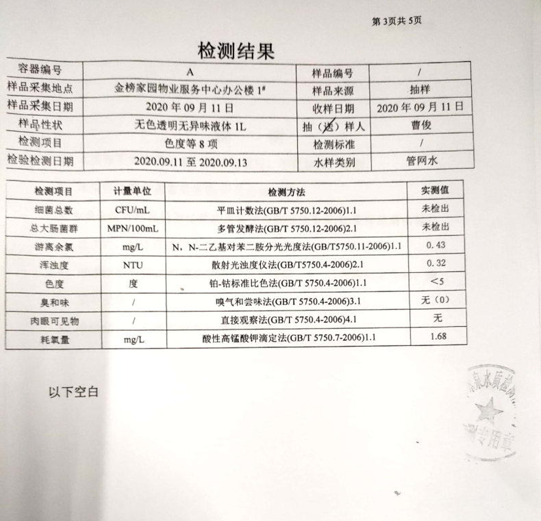 本著“用戶至上”的服務(wù)宗旨,為徹底消除用戶對荊城自來水水質(zhì)問題的疑慮,檢測人員再次進(jìn)行現(xiàn)場抽樣,并將水樣送至有相關(guān)檢驗(yàn)檢測資質(zhì)的第三方檢測機(jī)構(gòu)—荊門市詠泉水質(zhì)檢測有限公司進(jìn)行檢測。檢測結(jié)果顯示該用戶家中自來水各項(xiàng)指標(biāo)均符合《生活飲用水衛(wèi)生標(biāo)準(zhǔn)》(GB5749-2006)。具體檢測項(xiàng)目及結(jié)果見下圖: